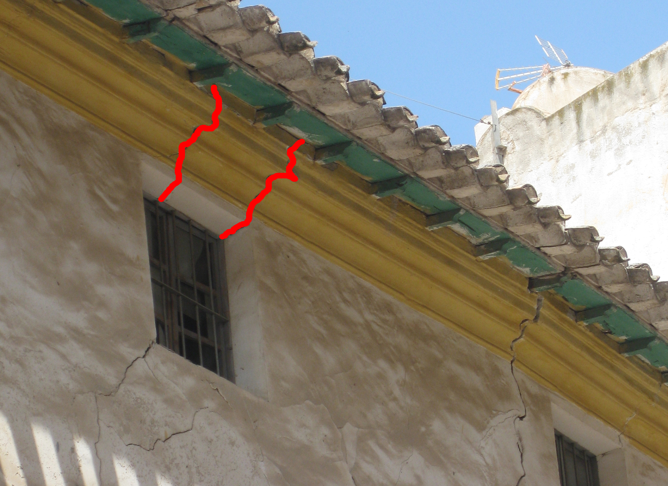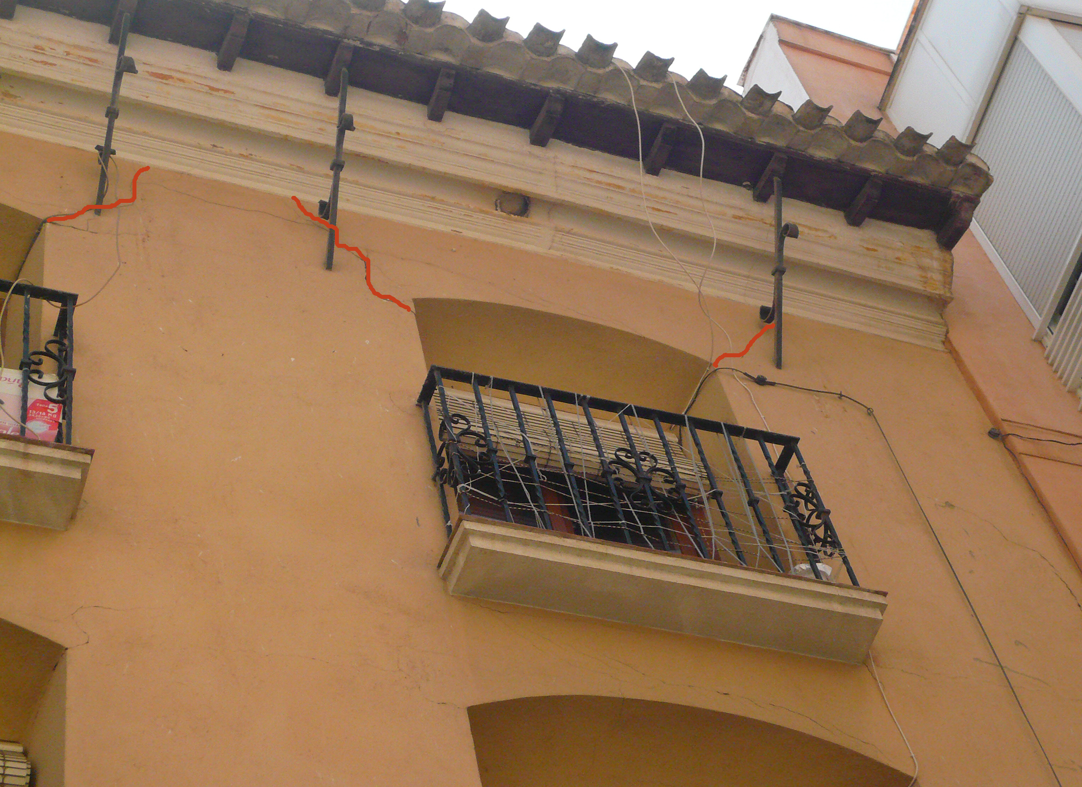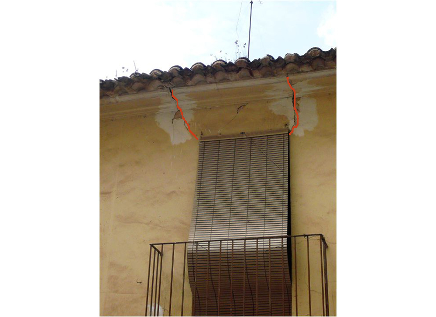 Fisuras verticales y/o roturas de trazado sensiblemente vertical en parapetos de ventanas, dinteles, arquitrabes o arcos, por debilidad del muro en esos puntos.