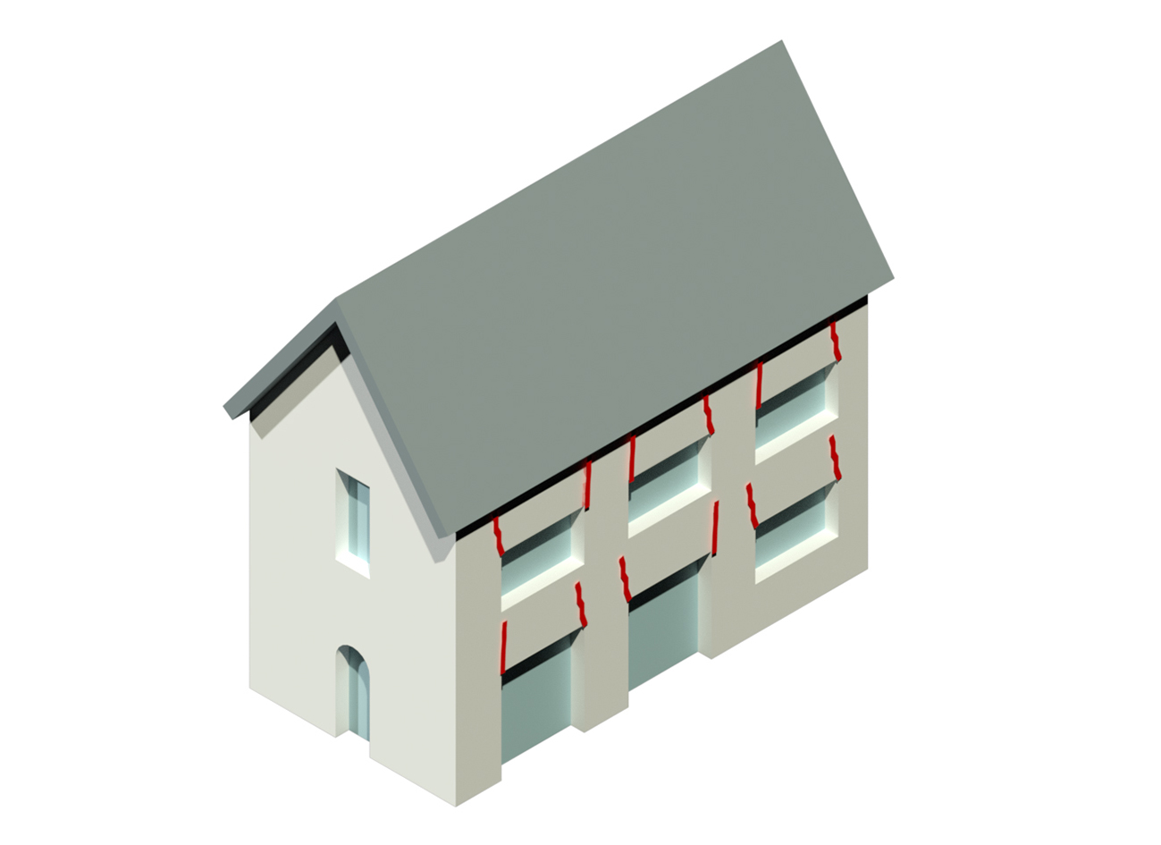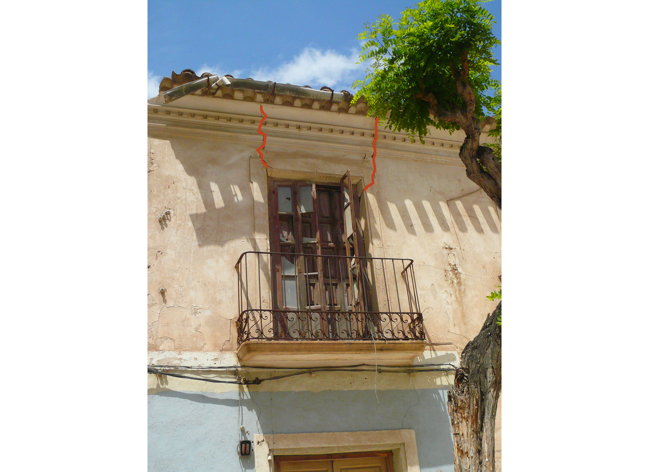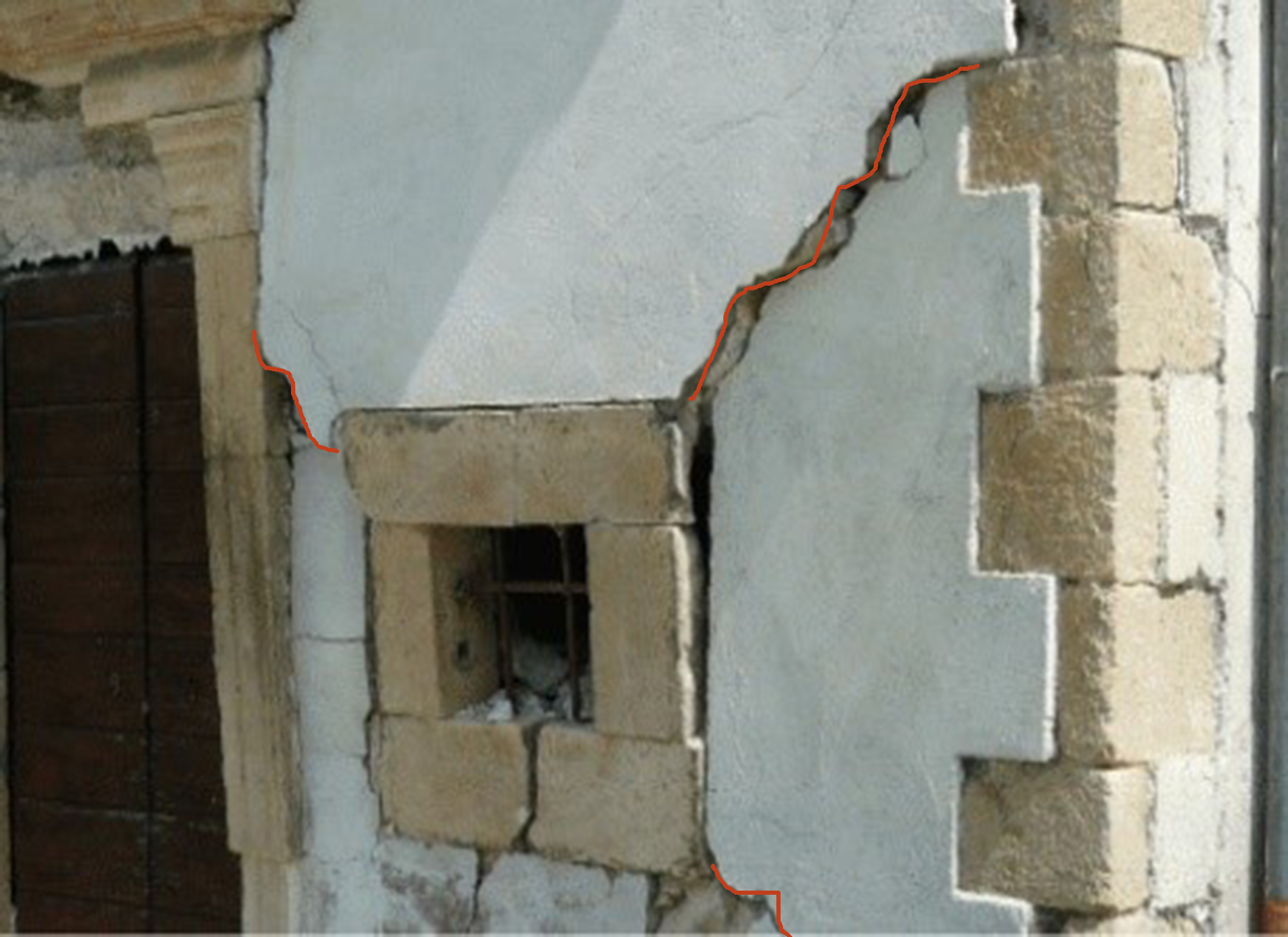 Fisuras verticales y/o roturas de trazado sensiblemente vertical en parapetos de ventanas, dinteles, arquitrabes o arcos, por debilidad del muro en esos puntos.