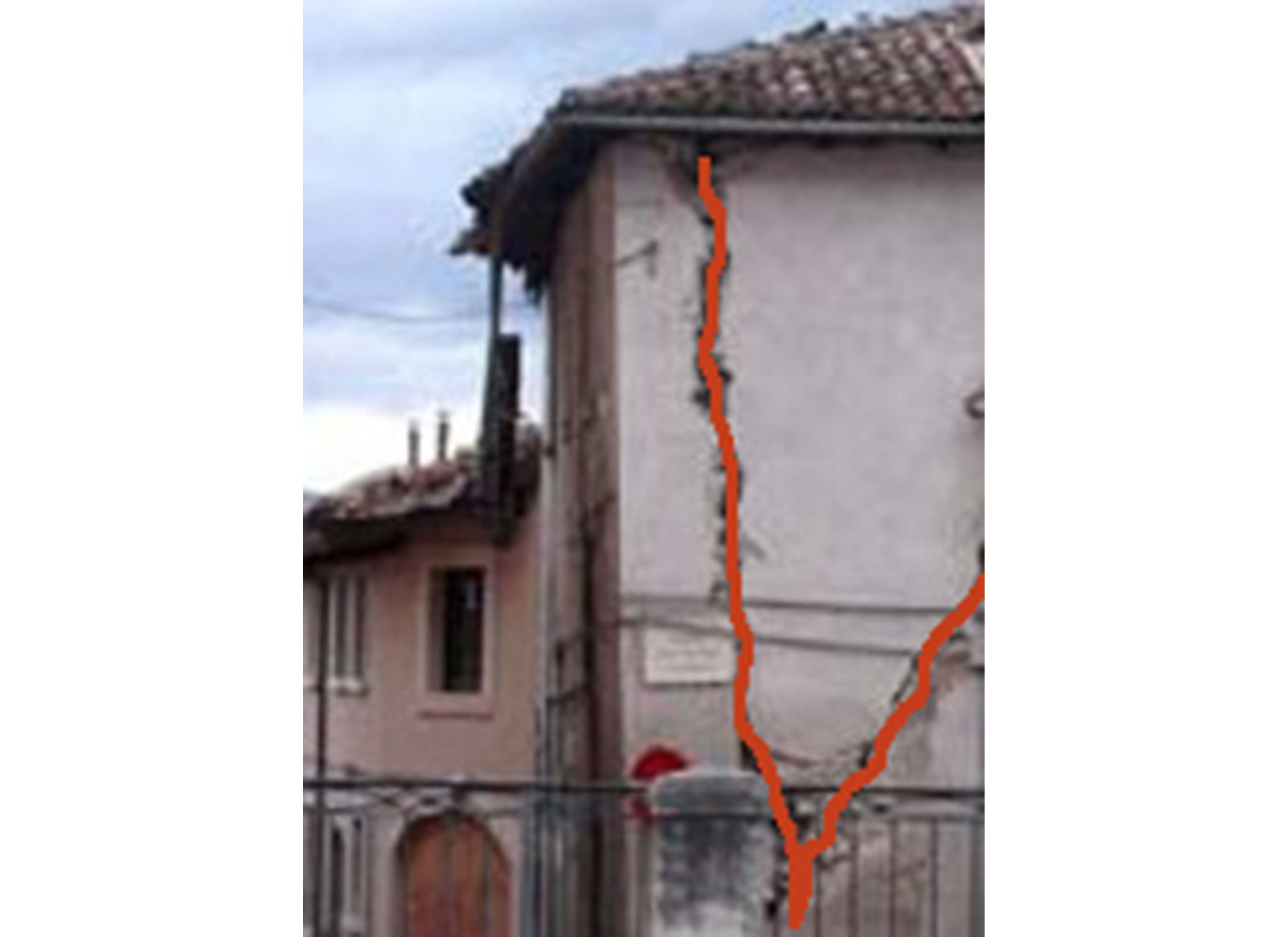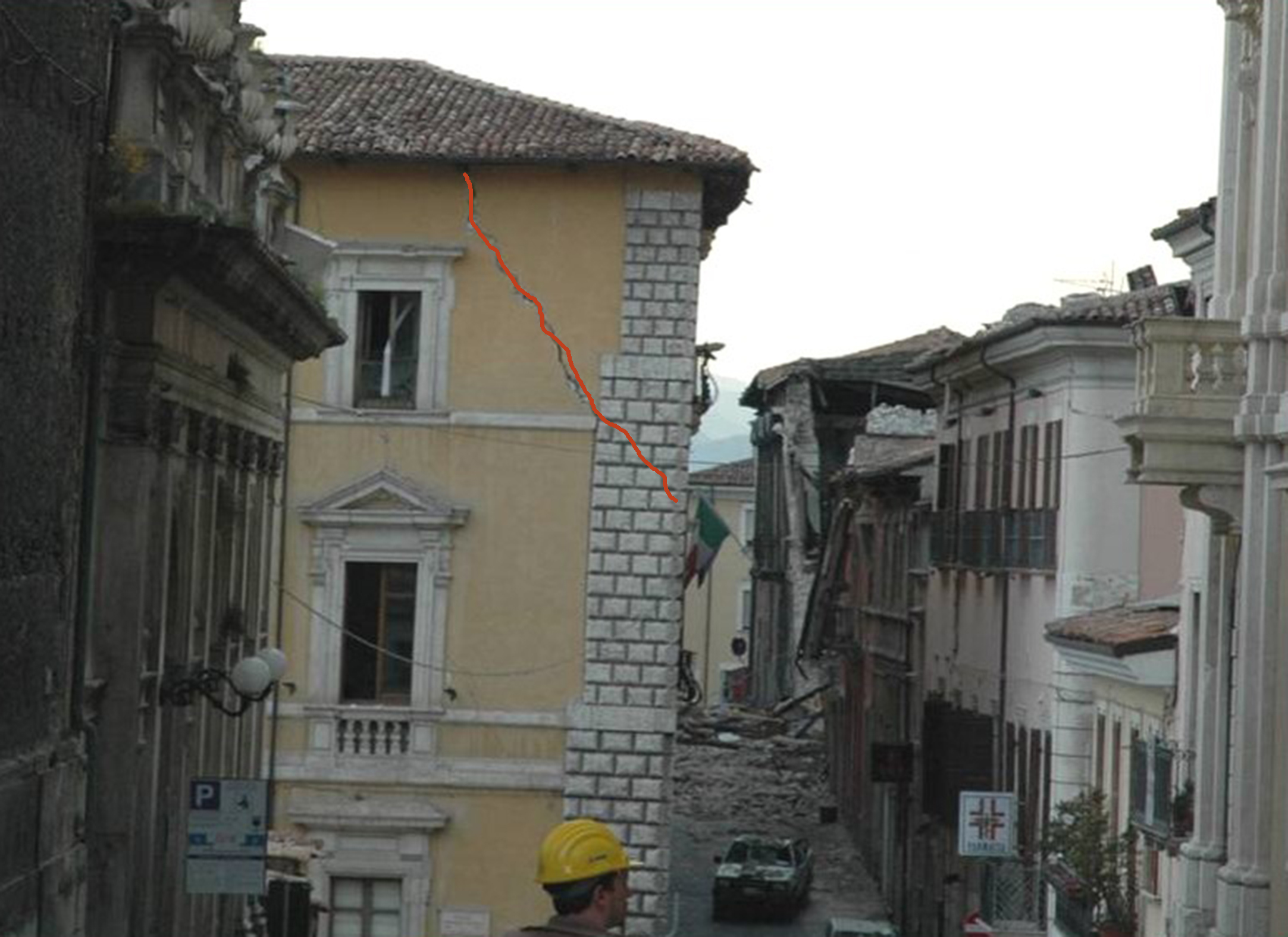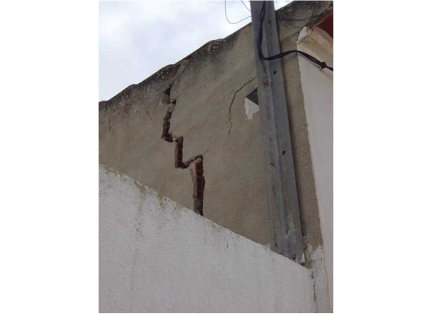 Este mecanismo se produce por rotura en los muros ortogonales quedando la unión integra entre fachada y muros laterales, produciéndose el vuelco de la fachada con el acompañamiento de los muros laterales. La unión con el forjado superior es deficiente y en general la calidad de los muros laterales es escasa.