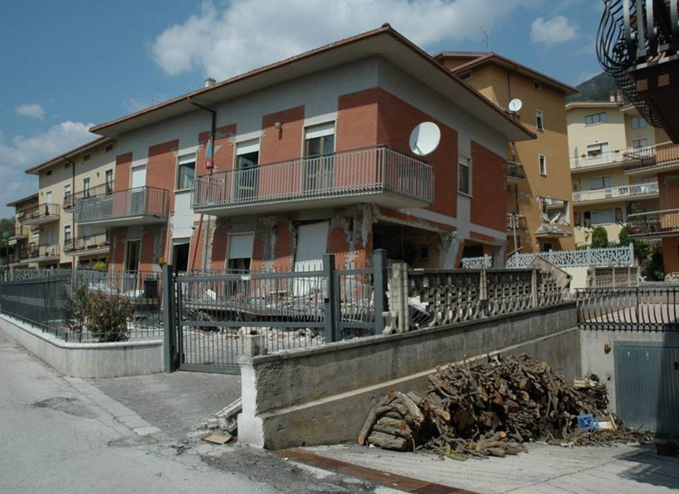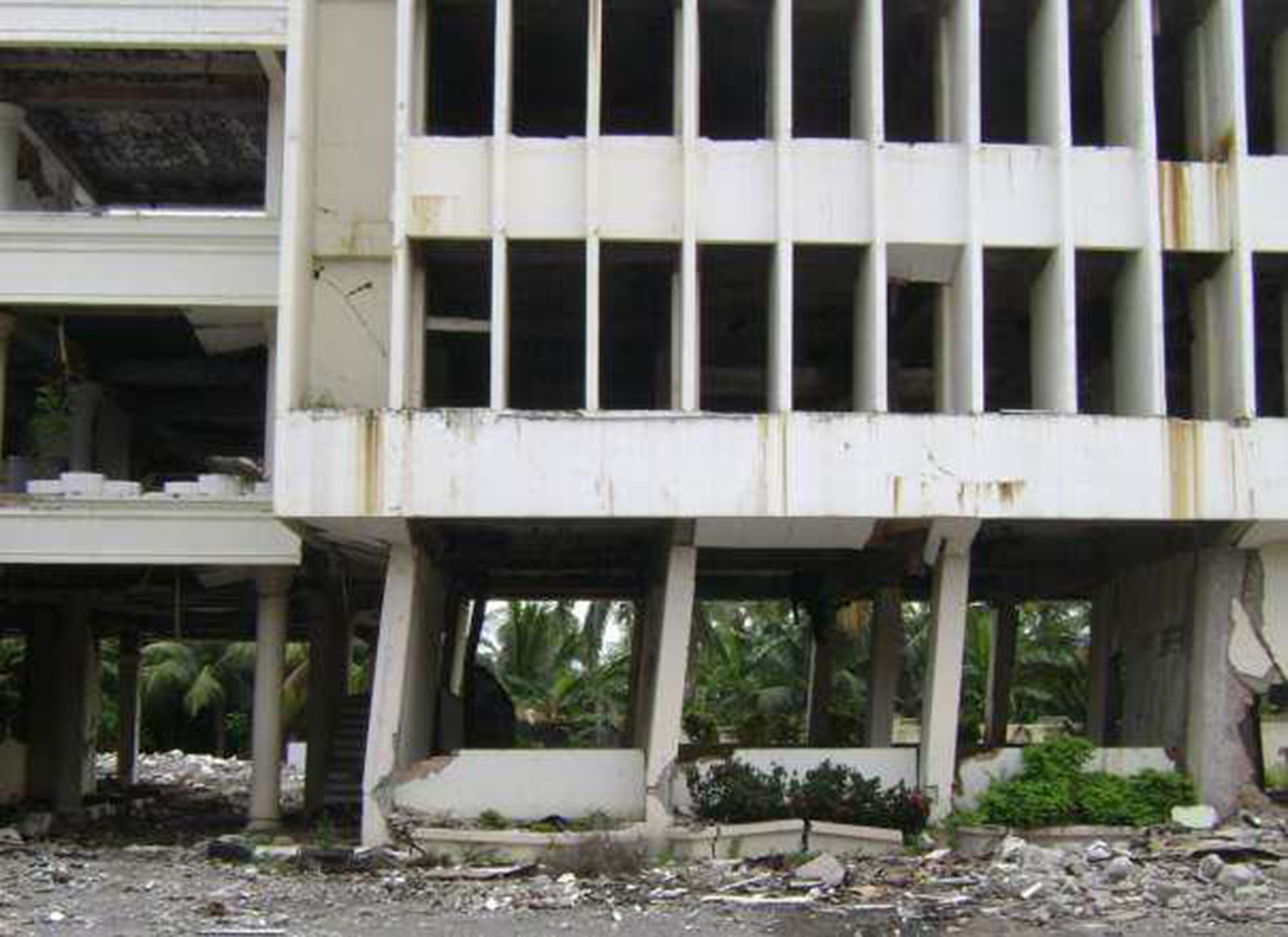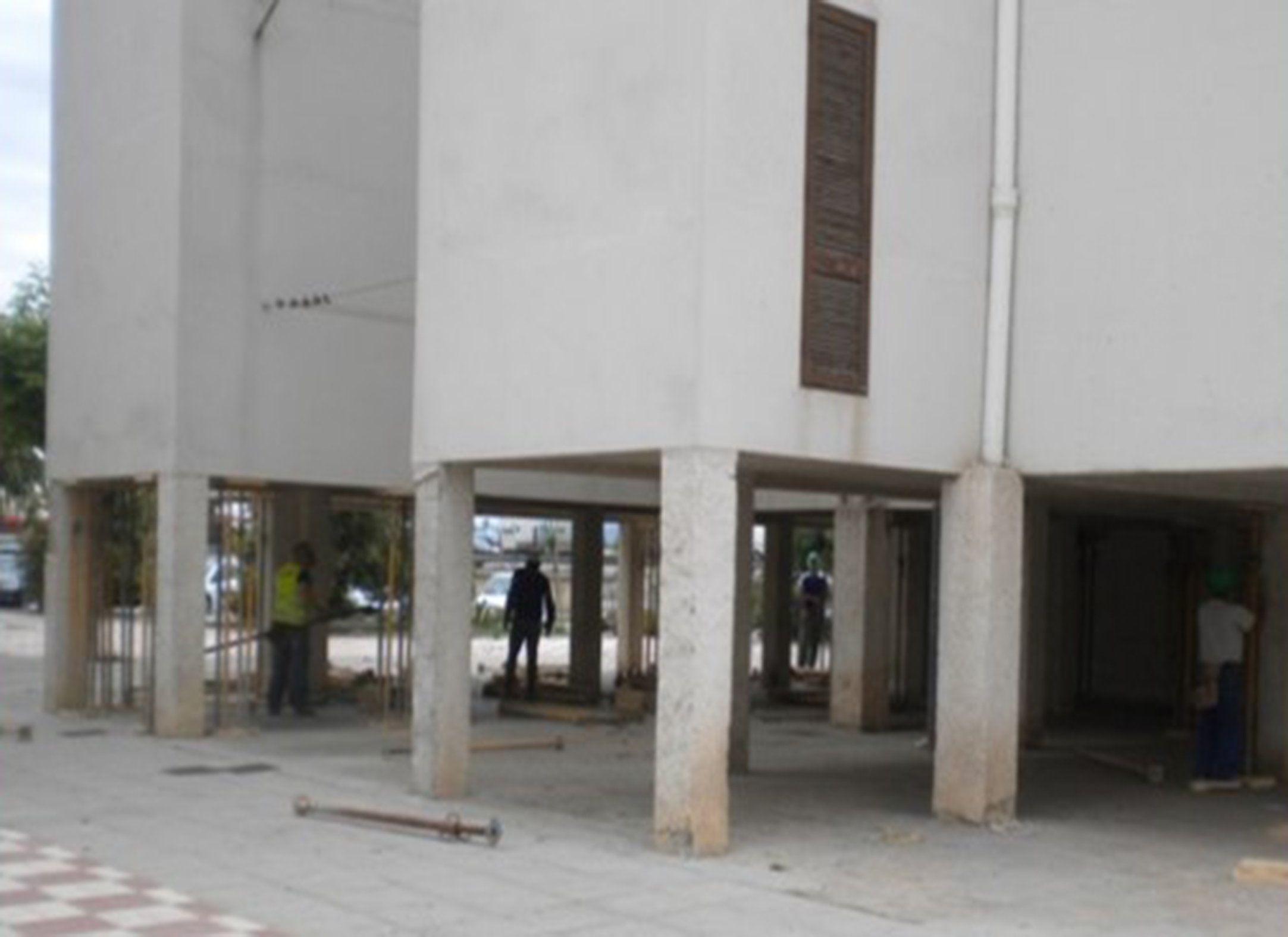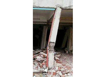 Pandeo de pilares de plantas débiles (caso de plantas bajas diáfanas, o plantas intermedias sin compartimentar) o escasamente compartimentadas frente a otras muy compartimentadas. La ductilidad de los soportes se reduce con la carga axial y en la planta baja están los más cargados y por tanto menos dúctiles (gráfica inferior derecha). Si los extremos del pilar están poco confinados (discontinuidad brusca de la rigidez entre la planta baja y la planta primera), el fallo a flexión, produce una articulación plástica, que gira por la solicitación de los momentos de flexión, por lo que se produce el pandeo de los pilares.