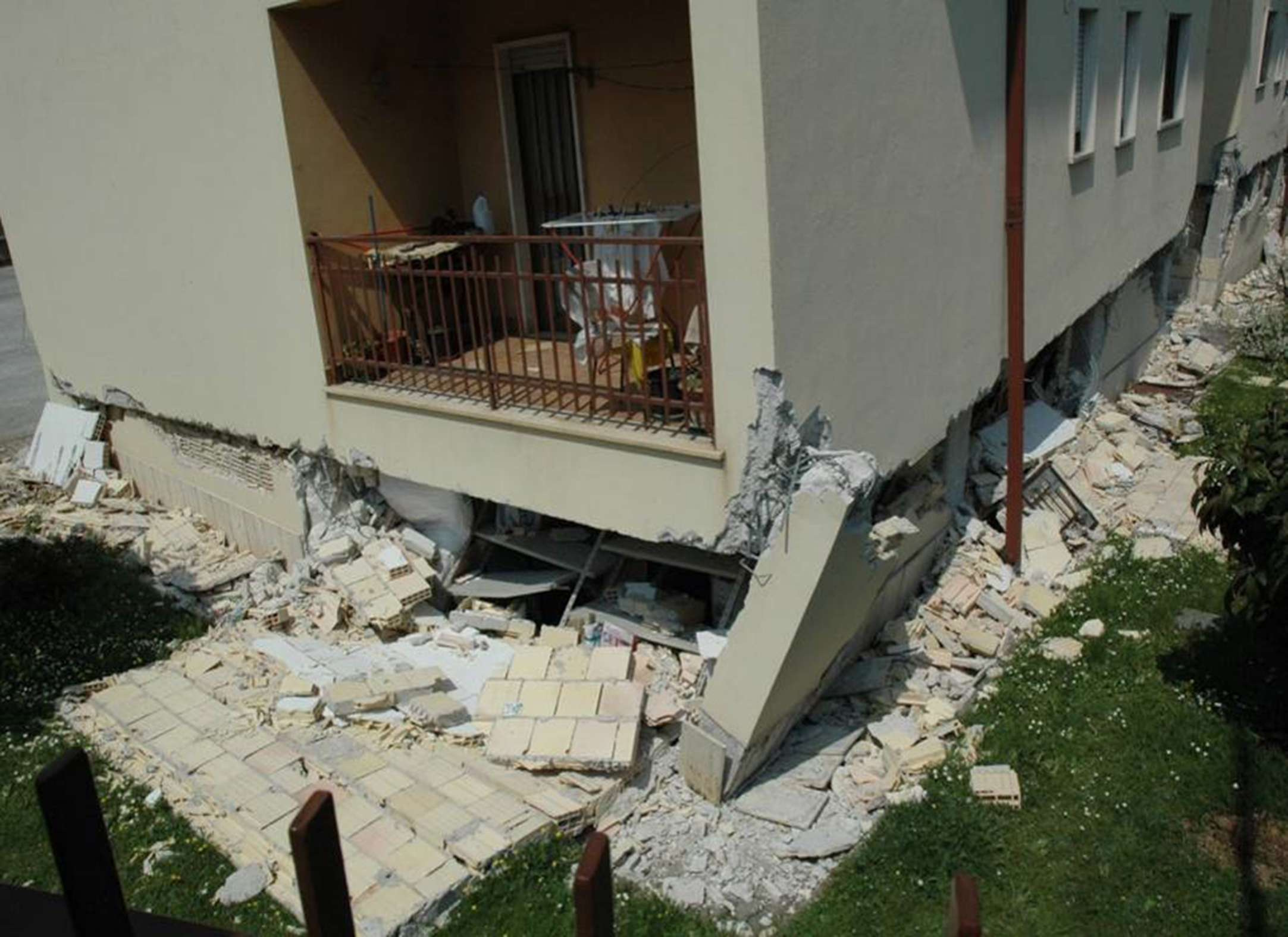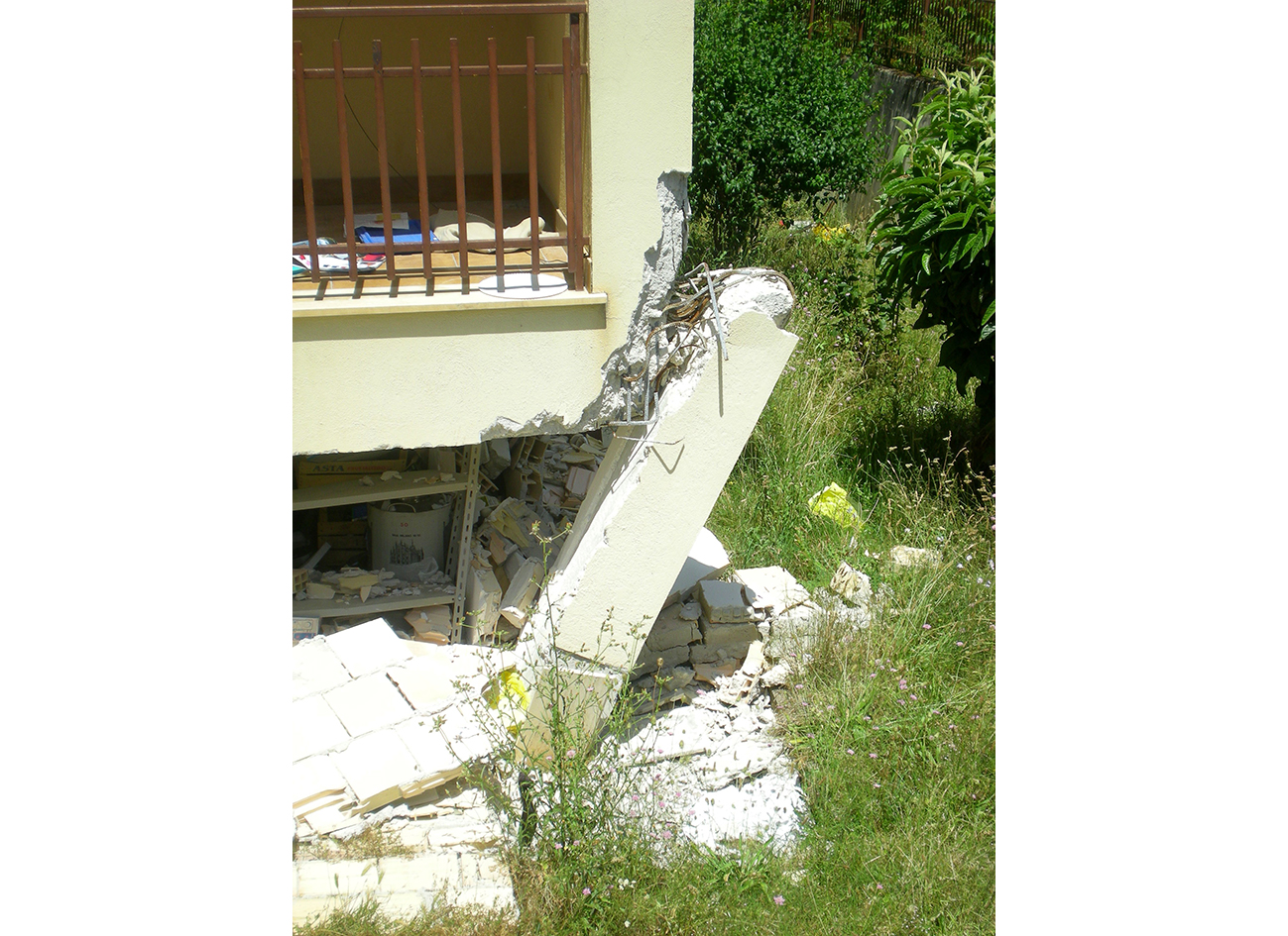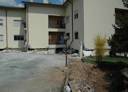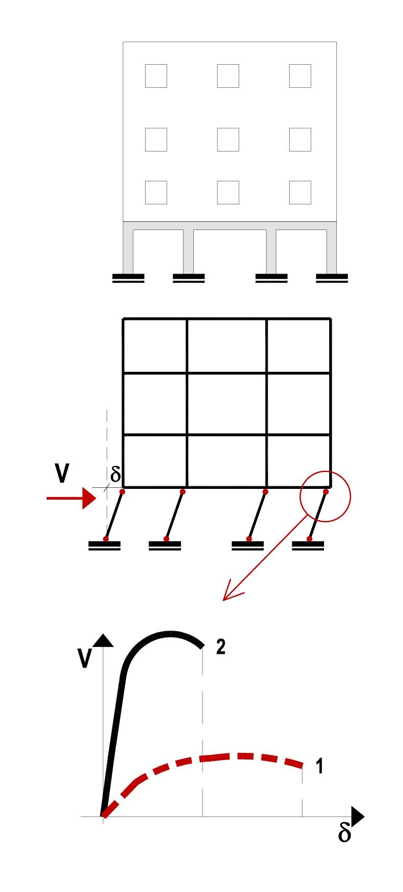 Colapso de pilares de plantas débiles (caso de plantas bajas diáfanas, o plantas intermedias sin compartimentar) o escasamente compartimentadas frente a otras muy compartimentadas. La ductilidad de los soportes se reduce con la carga axial y en la planta baja están los más cargados y por tanto menos dúctiles (gráfica inferior derecha). Si los extremos del pilar están poco confinados (discontinuidad brusca de la rigidez entre la planta baja y la planta primera), el fallo a flexión, produce una articulación plástica, que si no es capaz de girar (ductilidad) por la solicitación de los momentos de flexión, se puede produce el fallo y rotura frágil por compresión brusca del hormigón en cabeza y apoyo de pilares y por tanto el mecanismo de colapso y el desplome del edificio hasta el nivel del suelo.