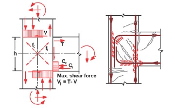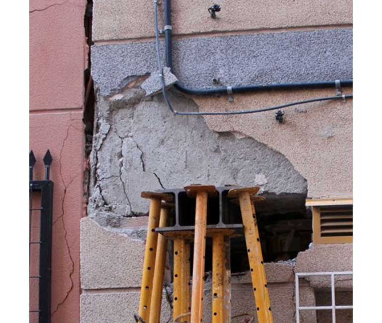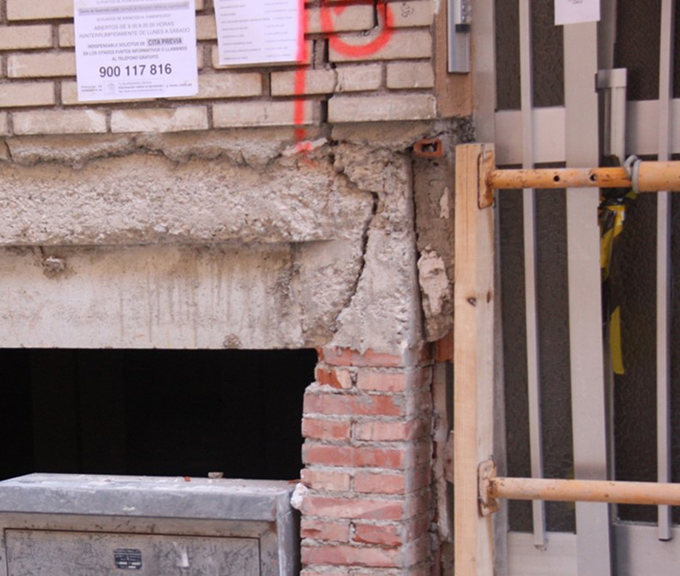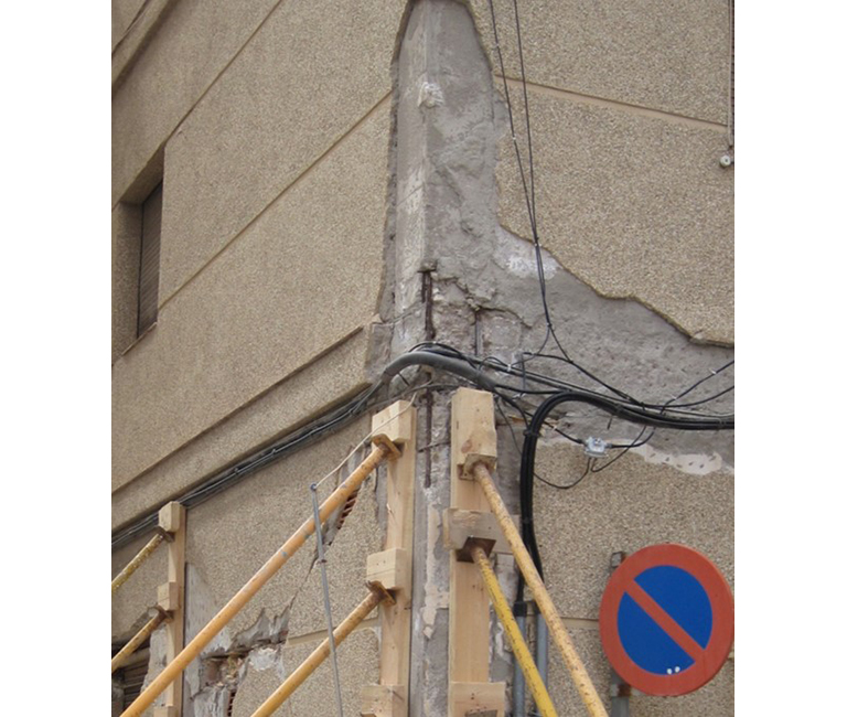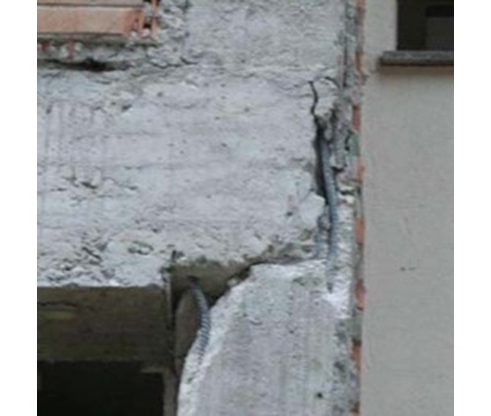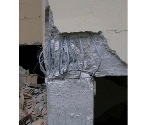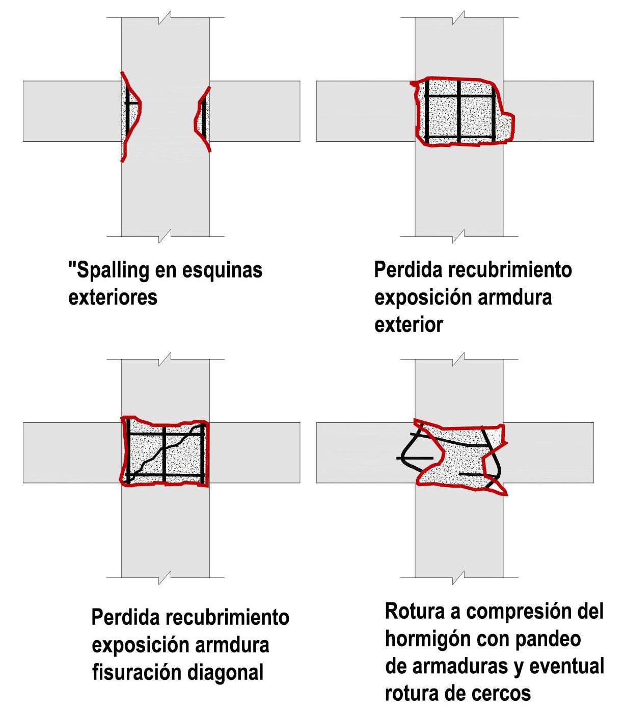 Pérdida de recubrimiento y/o roturas de nudos de unión vigas-pilares debido a la falta de confinamiento por insuficiencia o mala disposición de la armadura transversal, insuficiente para resistir los esfuerzos cortantes tan elevados que ocasiona el terremoto. El nivel de daños va desde un “spalling” en esquinas exteriores, pasando por una pérdida de recubrimiento con exposición de armadura exterior y fisuración diagonal, hasta llegar a la rotura a compresión del hormigón, con pandeo de armaduras y eventual rotura de cercos.